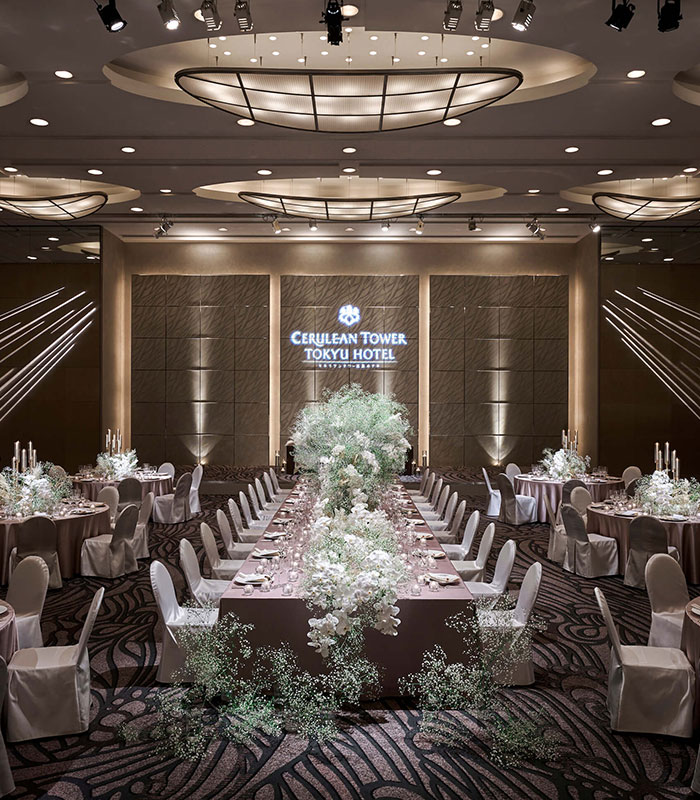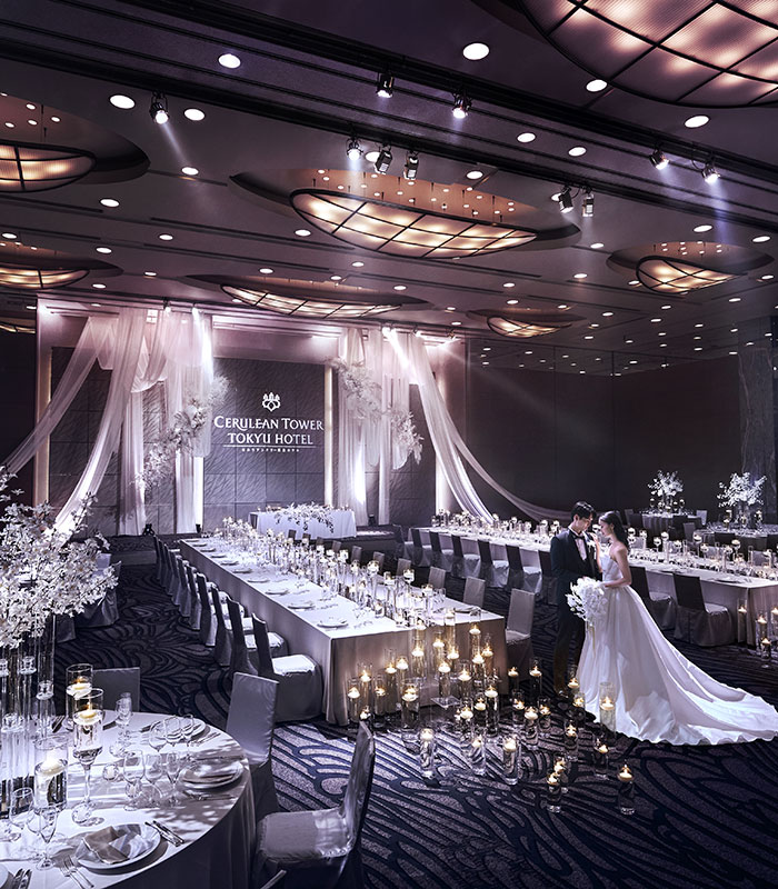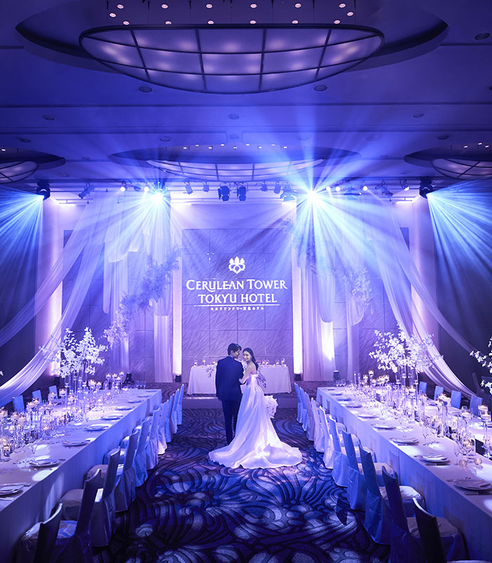 扉を開けた瞬間、インパクトあるダイナミックな空間がおふたりとゲストの目の前に広がります。 ホテルのメインバンケットにふさわしい最新の演出機器を駆使し、自由で多彩な演出のご提案も可能。 ホテルウエディングらしい華やかでゴージャス、ドラマティックなスペースで、真心を込めたおもてなしをいたします。